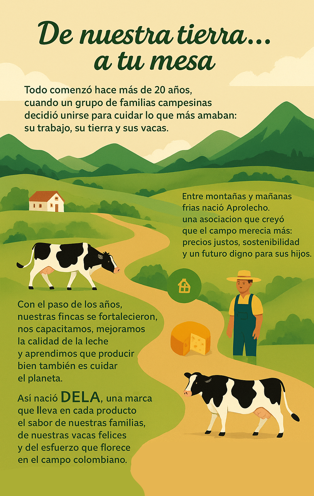 Así nació DELA, una marca que no solo transforma la leche, sino que transforma el futuro de nuestras familias. DELA viene de nuestro propio hablar campesino: “DELA mejor finca”, “DELA mejor vaca”, “DELA mejor organización”. Porque cada producto que llevamos a tu mesa refleja el esfuerzo y el orgullo de ser campesinos.